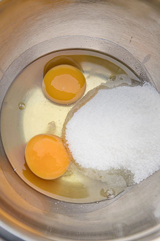 Am mixat ouale cu un varf cutit de sare si zahar pana au devenit cremoase si si-au dublat volumul. In acest timp am pus ciolata si untul la topit, la bain-marie.