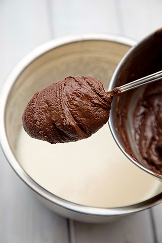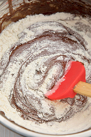 Am pus ciocolata topita dar usor calduta peste oua, am mixat rapid, la viteza mare, apoi am incorporat faina amestecata cu praf de copt.