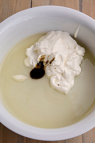 Am topit untura, apoi am lasat-o sa se raceasca la temperatura camerei. Am adaugat smantana si pasta de vanilie si am amestecat pana s-a omogenizat compozitia.